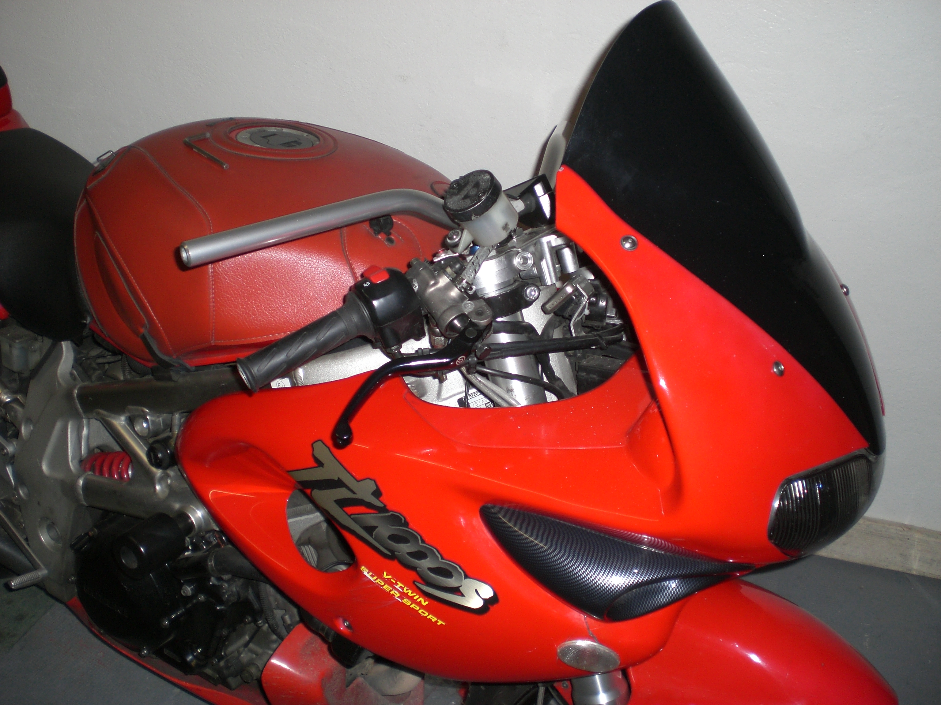 pour le guidon relevé j'ai pris un modèle dit "roadster"alu,assez cintré et pas trop large pour passer entre les retros des voitures (j'envisage un guidon d'ER6 comme sur mon ex CB)