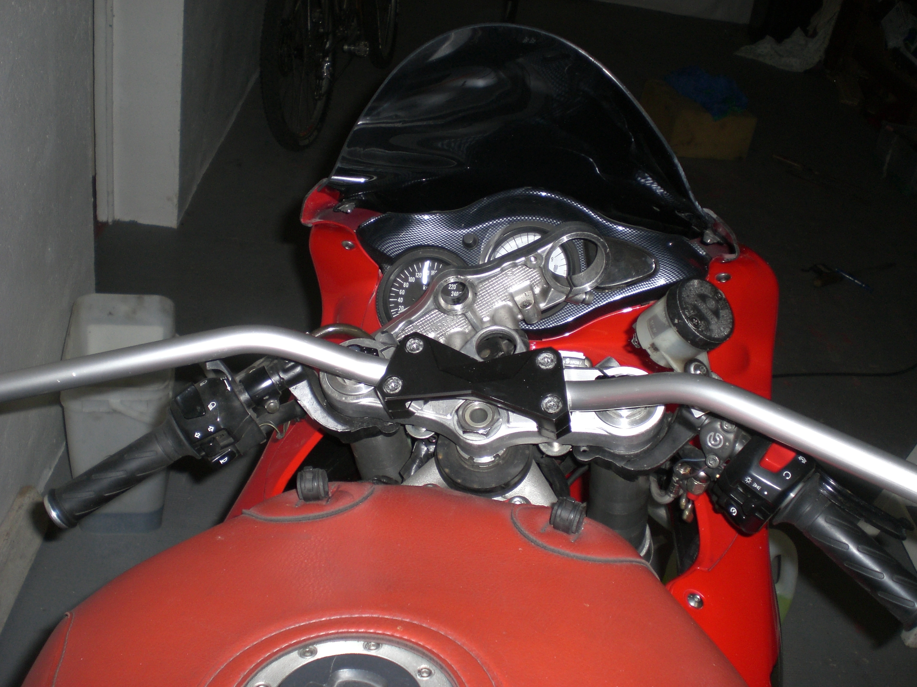 pour les pontets j'ai trouvé un pontet de Z1000 assez bas,monté à l'envers pour profiter du deport arrière .j'envisage de peindre ou de faire anodiser en noir le T dédié à la modif car il est un peu rayé .