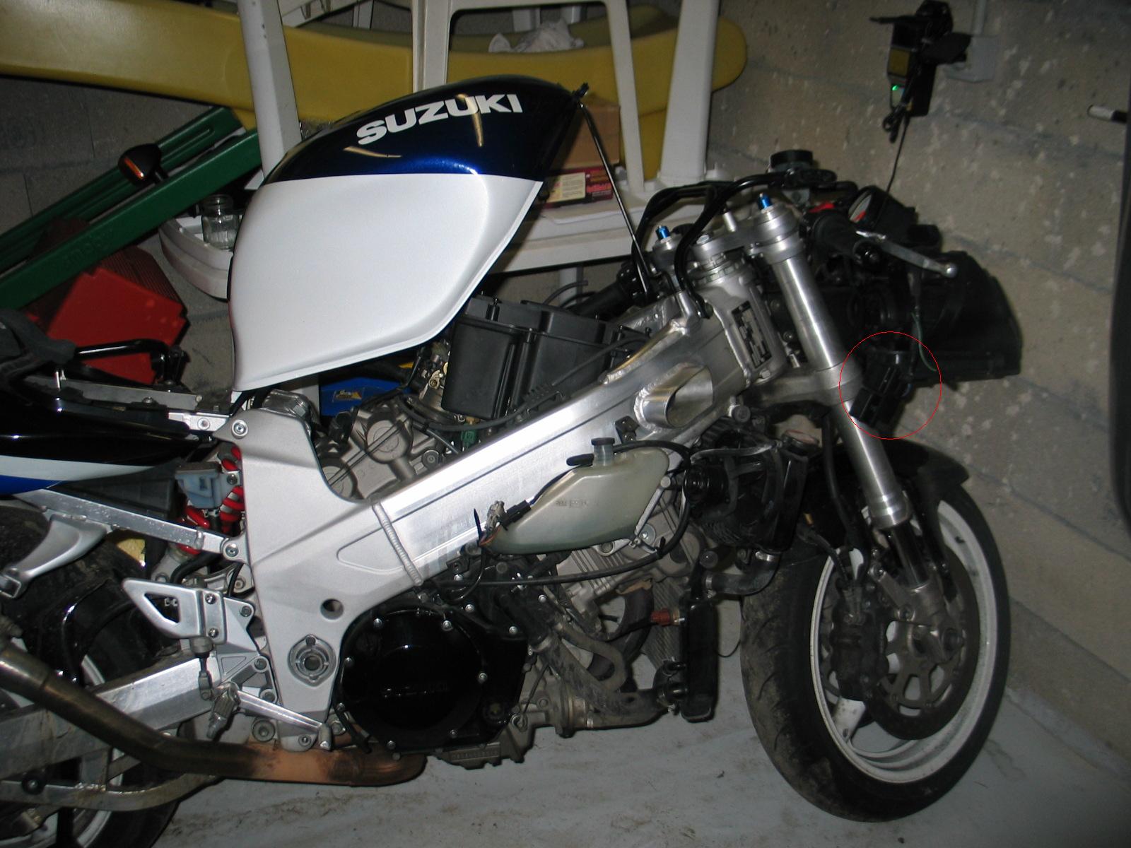 Une petite photo où on voit pendre le porte fusibles entouré en rouge, mais là, désolé les gars, j'avais démonté les carénages et même levé le réservoir, mais pas tombé les deux pneus