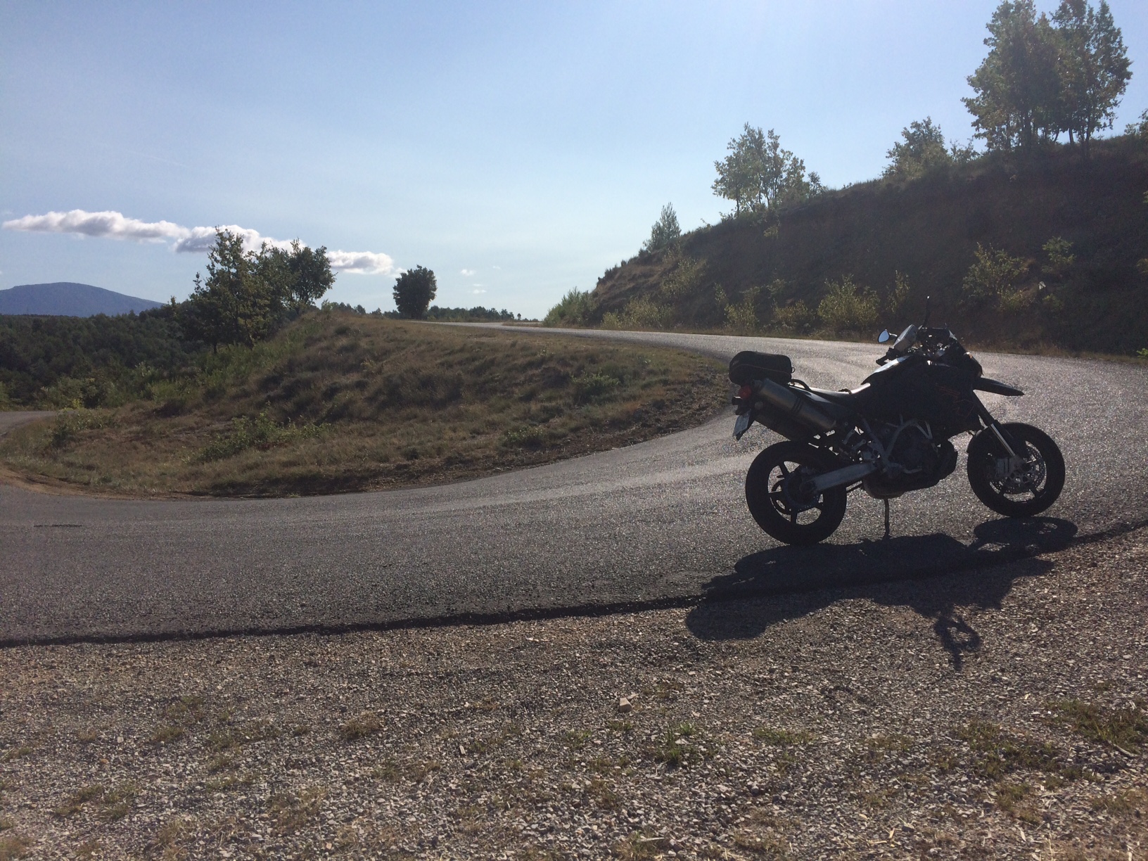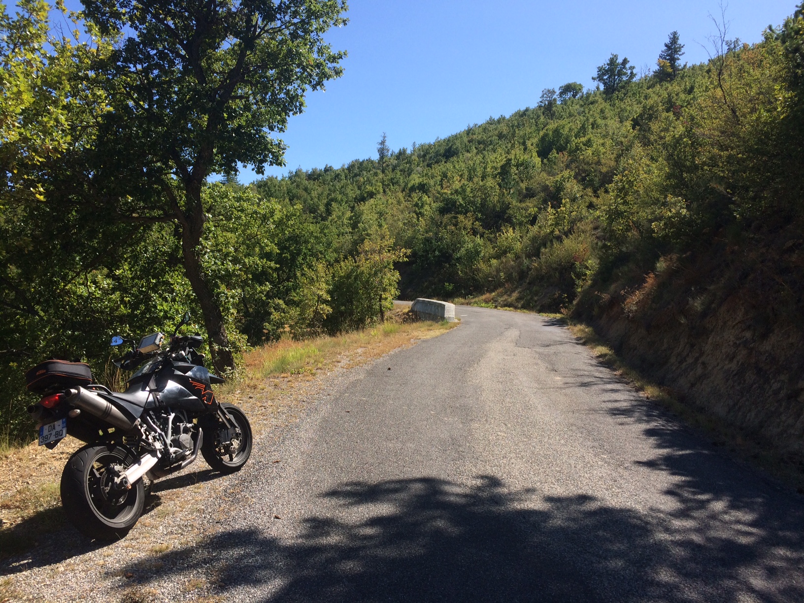 Encore beaucoup d'appréhension sur ces routes au bitume souvent incertain, avec ce revêtement super abrasif mais sur lequel tu ne sais jamais si le gravillon est collé dans le bitume ou gentiment déposé dessus. Et puis en cette fin de saison le soleil est encore bas en milieu de matinée, donc la route souvent ombragée par la végétation, ce qui n'incite pas non plus à faire n'importe quoi.