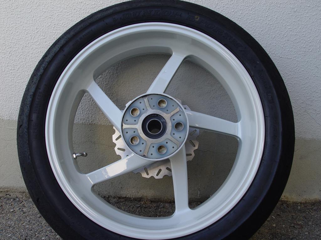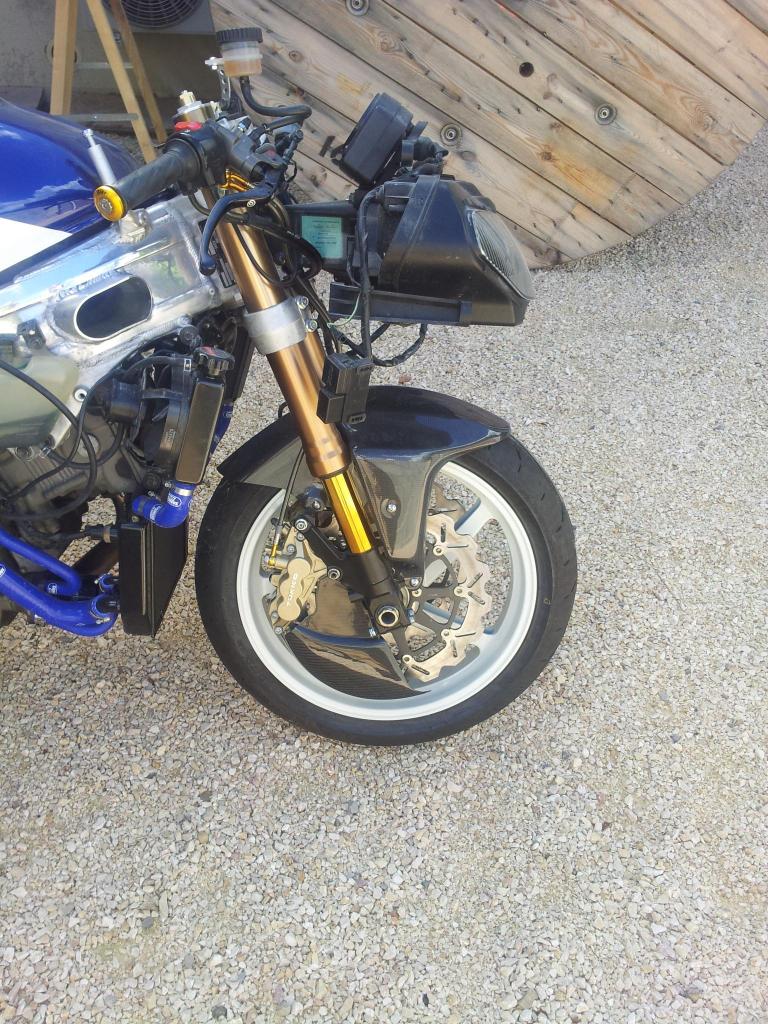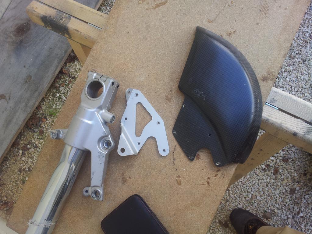 Comme sur l'avant dernière photo , il eu le montage des freins avant avec un Brembo taillé masse et des écopes de freins .