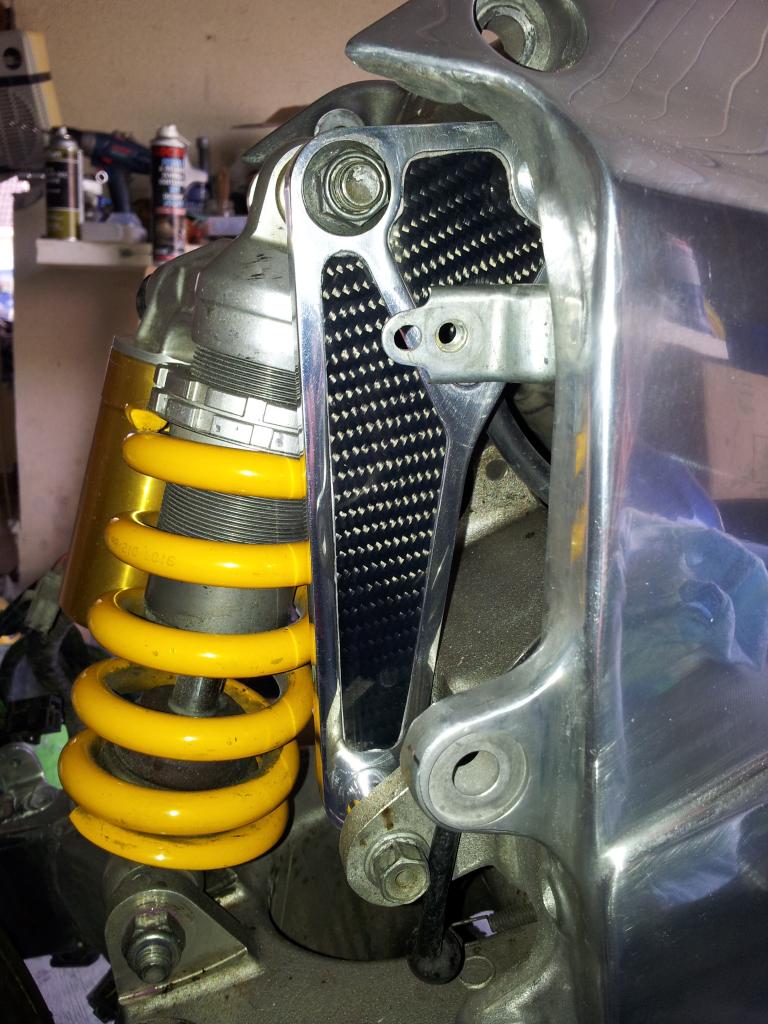 la complexité de polir certains endroit me donna l'idées de faire de mettre du carbon sur les supports de l'Ohlins et de faire des protections inférieur de B.O.