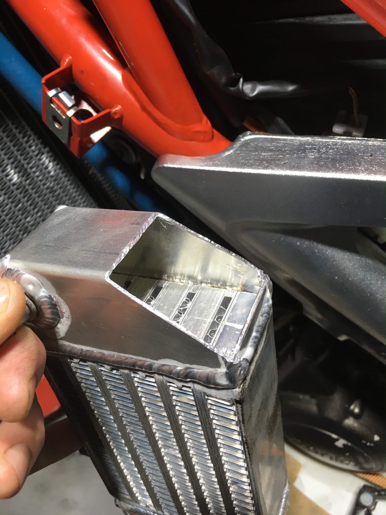 Bon, je vous la fais courte, mals comme il n'y a pas grand chose de vraiment "plug and play", on a passé pas mal de temps à débattre sur l'emplacement (devant ou derrière le radiateur d'eau, ou en bas au milieu), sur le coté, sur l'adaptabilité éventuelle d'un radia existant, sur la compatibilité de la forme des E/S avec le peu d'espace disponible sur la brêle.... bref de longues semaines de prise de tête pour finalement en arriver à la conclusion que : sur mesure, ou rien !