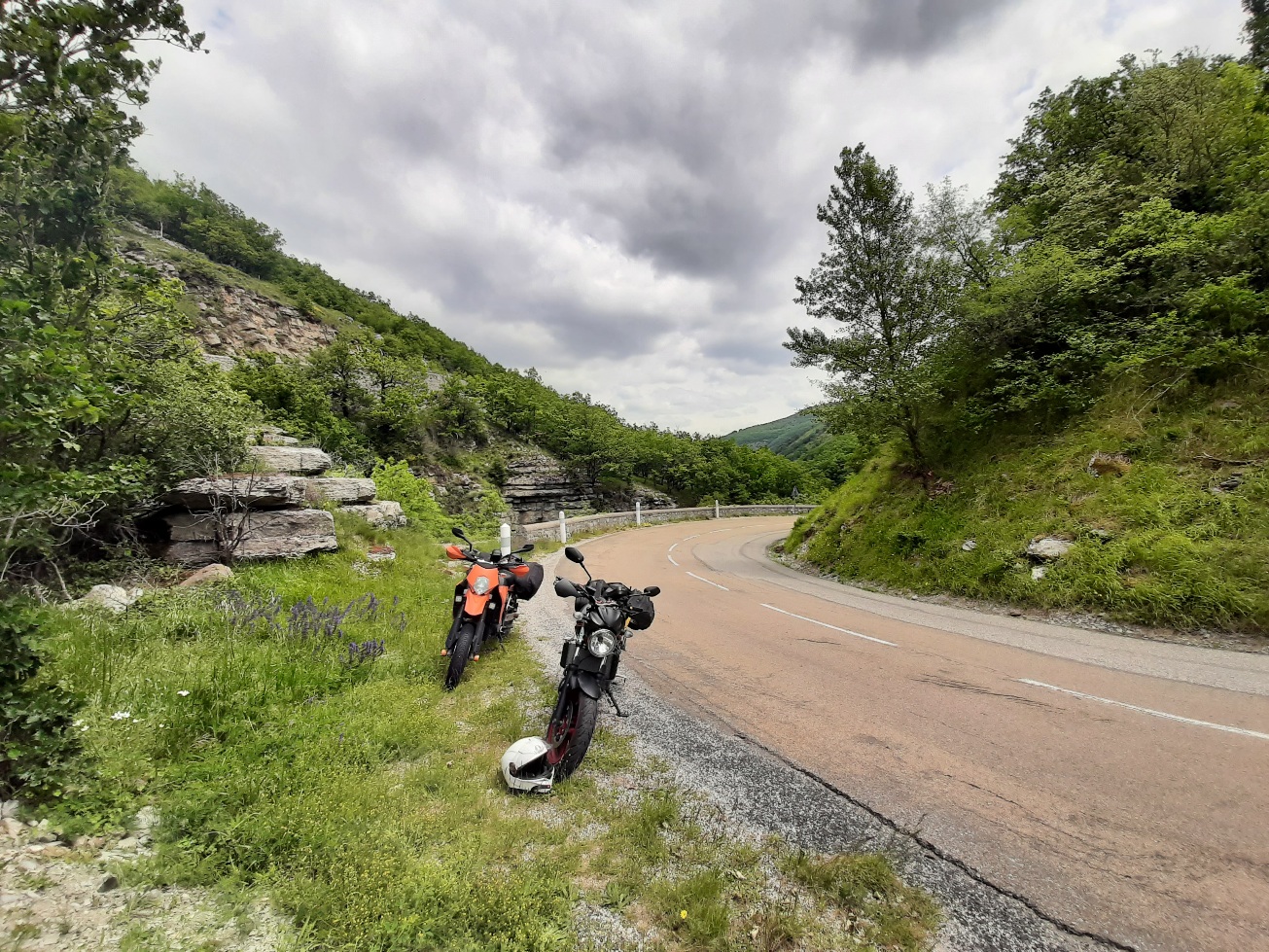 On reste sur la D579 jusqu'à Ruoms, où je me colle une montée en température en appuyant par inadvertance sur le coupe-circuit du KT ( j'étais sur point de sortir les outils quand Sandrine m'a posé la question). Ok, ça arrive à tout le monde...
