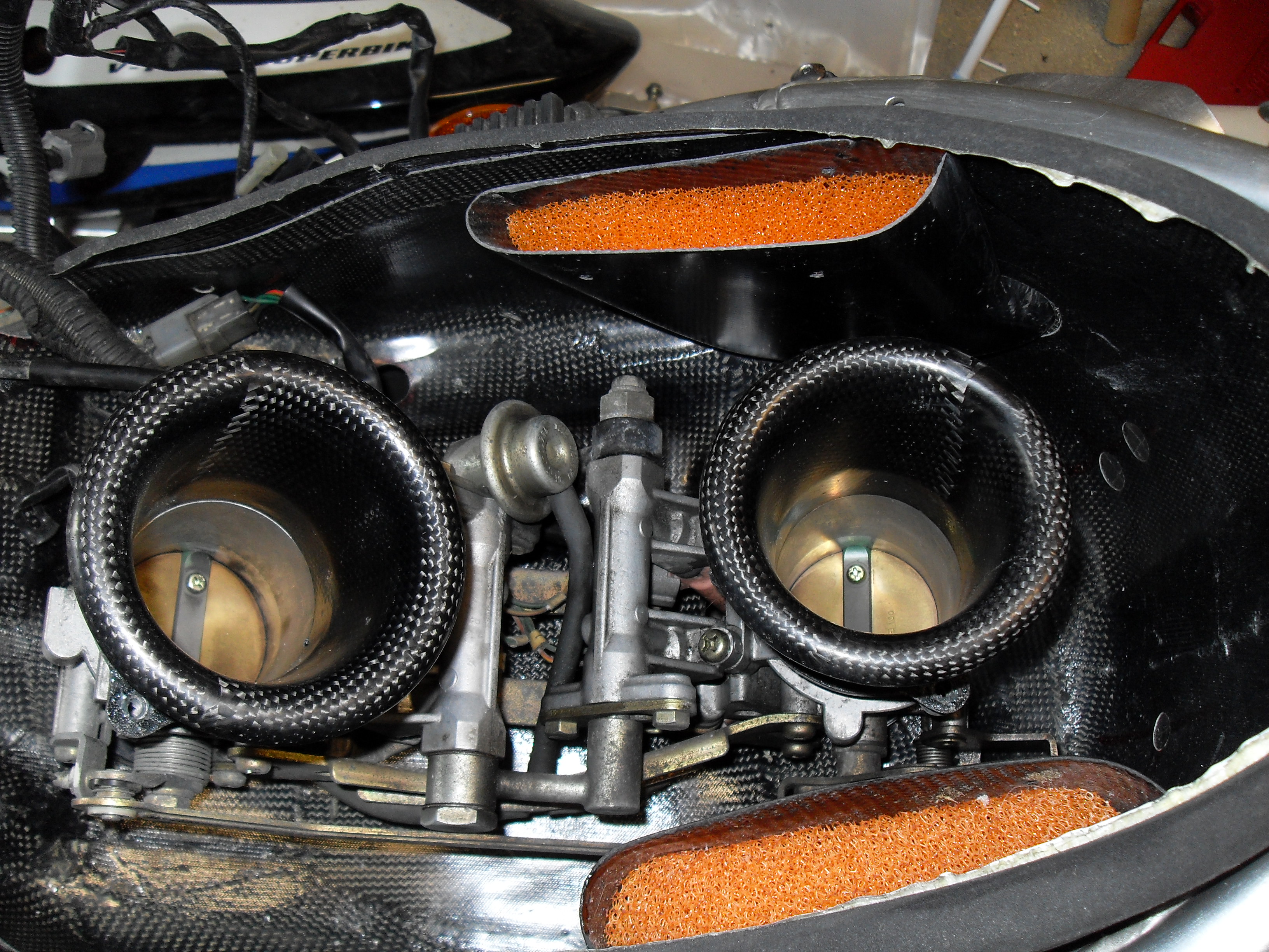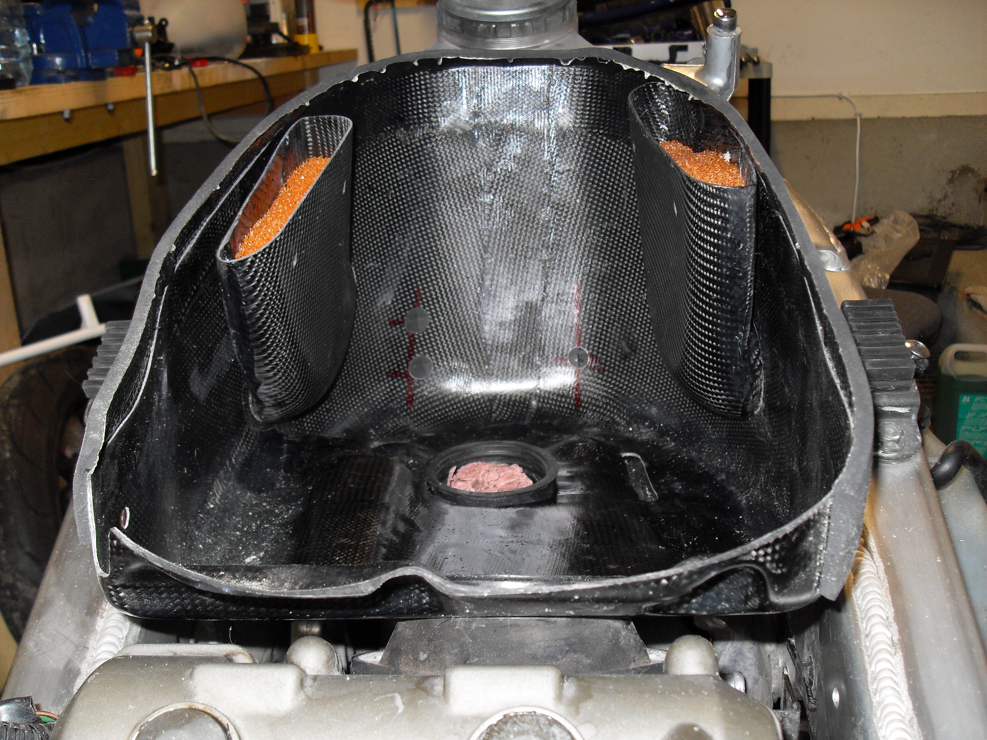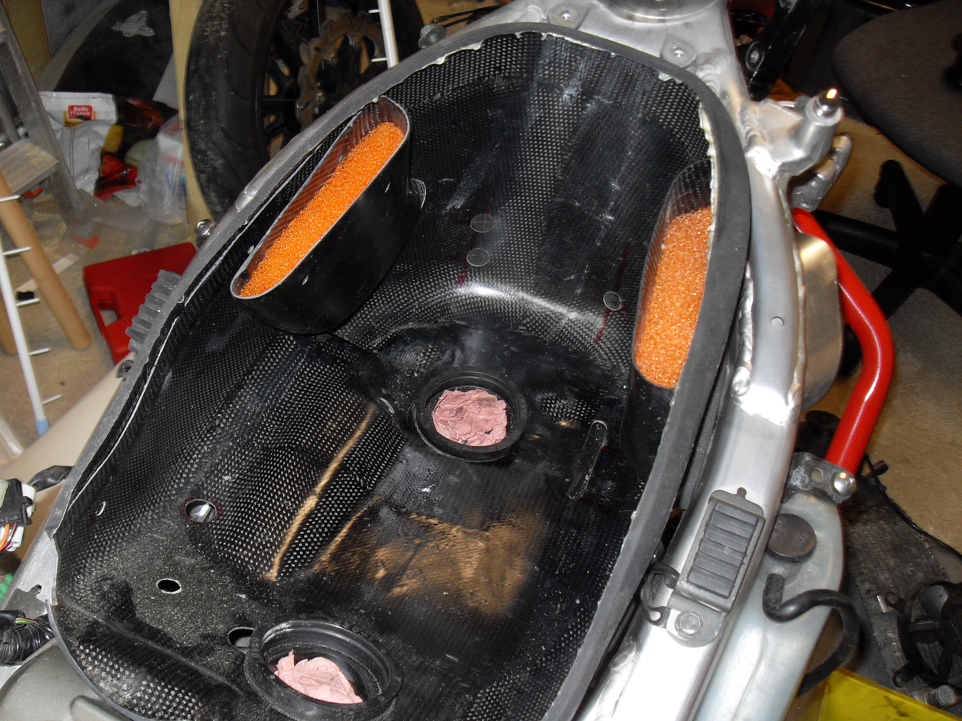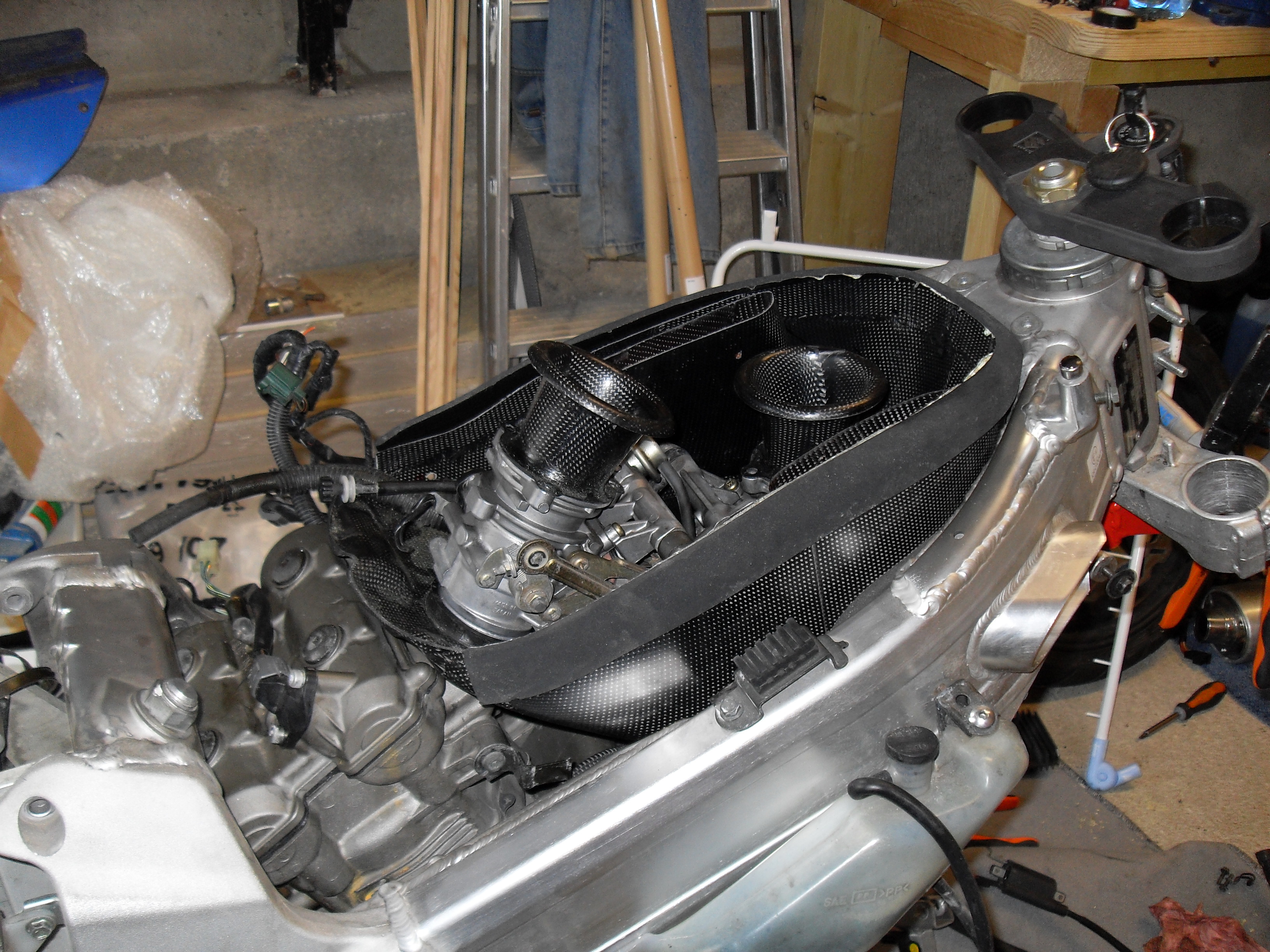 J'attends mes durites silicone pour le circuit de liquide de refroidissement. Donc j'ai fait un montage à blanc, voici ce que ça donne: Donc la boite a air carbone n'a pas de couvercle, c'est le réservoir qui fait office de couvercle pour optimiser le volume.
