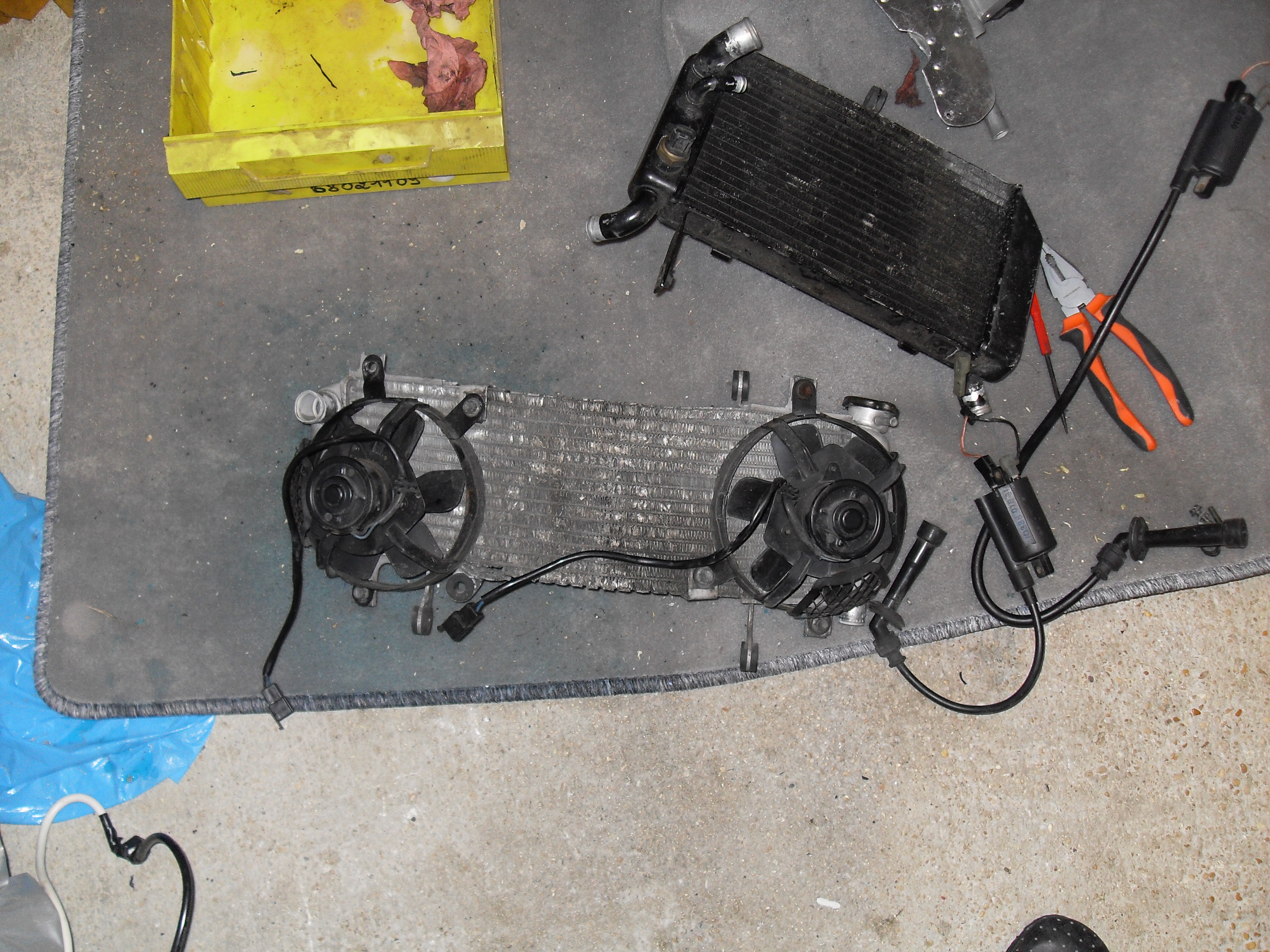 Alors voila l'état d'un moteur après 46000km sous le soleil, la flotte et la neige: Premier passe de nettoyage, je ferais les fignollages demain: J'ai stocké mes tous beaux radiateurs de TL et je prépare des radias qui ont déjà pris une buche que j'ai acheté spécialement pour la piste Voila les courses du jour: Cf le topic de modif électrique du TL