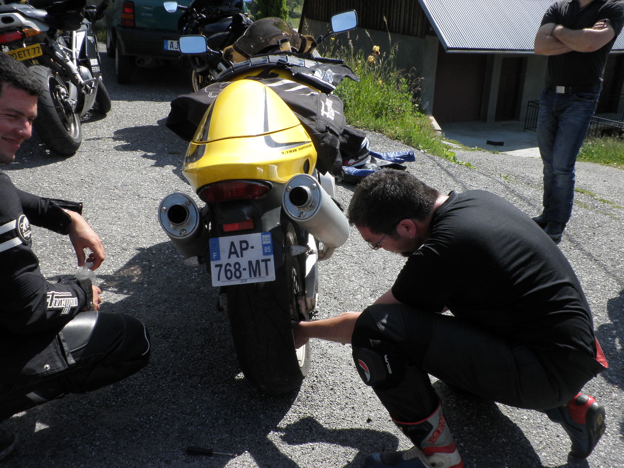 un petit chemin plus tard et encore une pause ... j'ai doubler Chris avec sa Katoche ... ils envoient plus qu'avec sa ducat en tout cas ... et là ... première galère et première tout cours car c'est là première crevaison dans un VTSC TT ... merci Bézedache