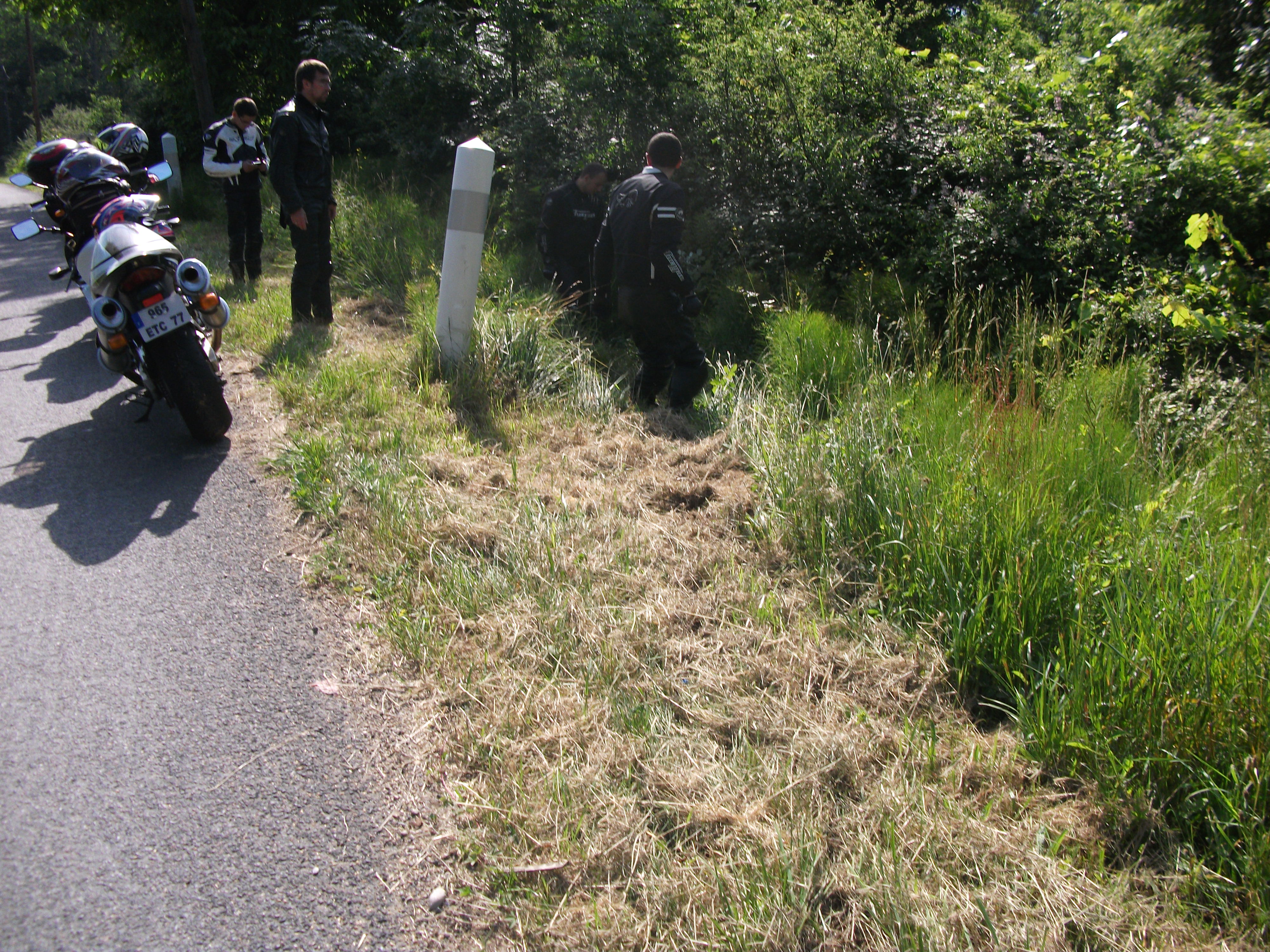 Vendredi matin , départ pour le RB de Chris : 425 bornes de prévues !!! :cheers: :cheers: :cheers: :cheers: 40 kms de ligne droite puis au premier virage digne de ce nom , voilà t’y pas que je fais un saut de cabri :confused1: :confused1: du à une bosse et une chaussée déformée …. Bon pas grave …faudra juste que je ne le refasse pas deveant Lolow hilare sous son casque….2 kms plus loin , plus personne ne suit … demi tour , le petit gars en gex 600 est dans le fossé :? :? :? ….le saut de cabri ne lui a pas reussi …..dommage , la balade s’arrete là pour lui sans bobos mais la gex un peu froissé de l’avant :( :(