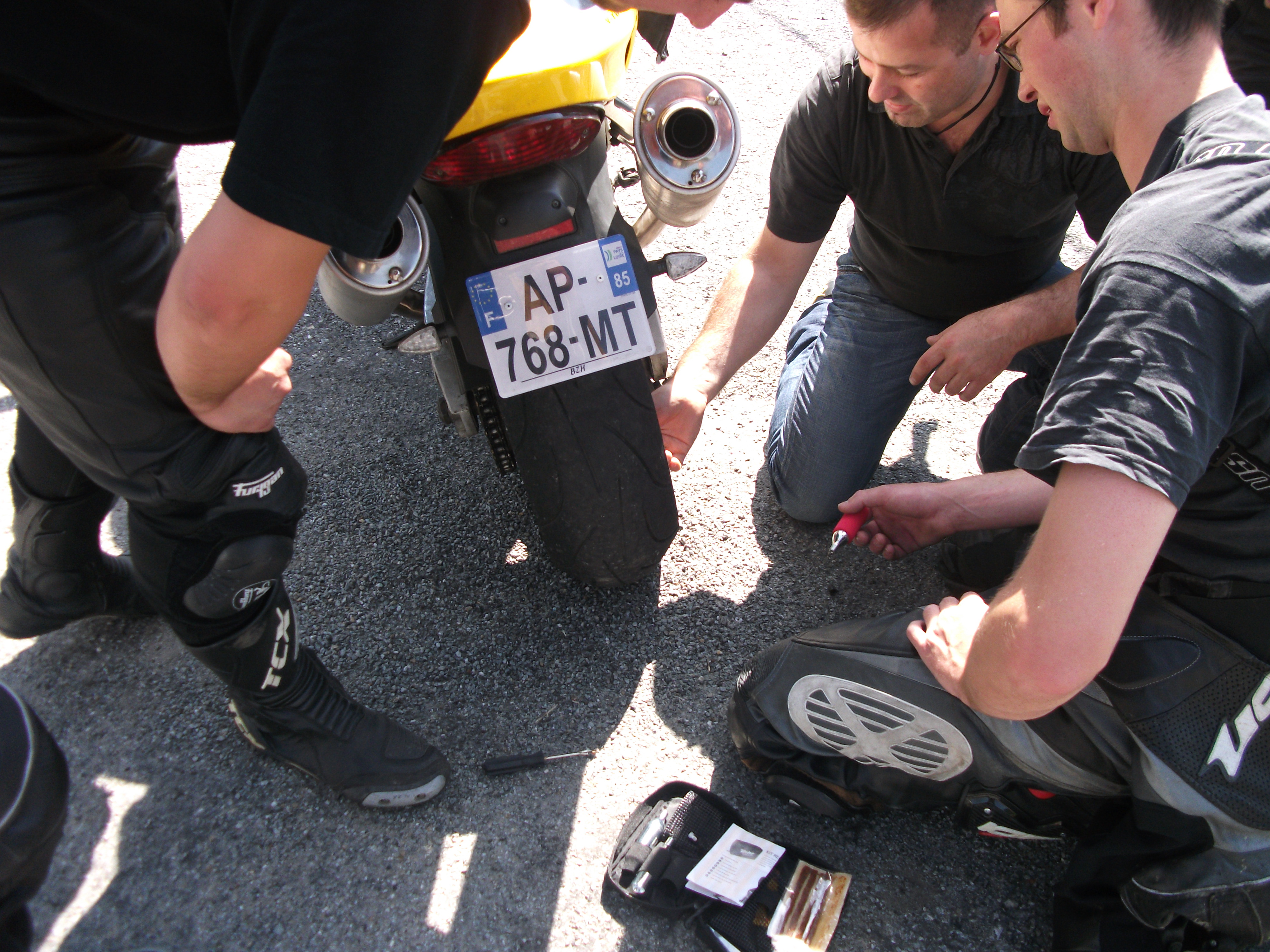 Premier gros arrêt , une crevaison ; certains découvrent le kit de réparation :?: :?: :drunken: , les jeunes s’activent autour du pneu, les vieux se rafraîchissent : chacun son activité … quoi ??? :mrgreen: :mrgreen: :mrgreen: