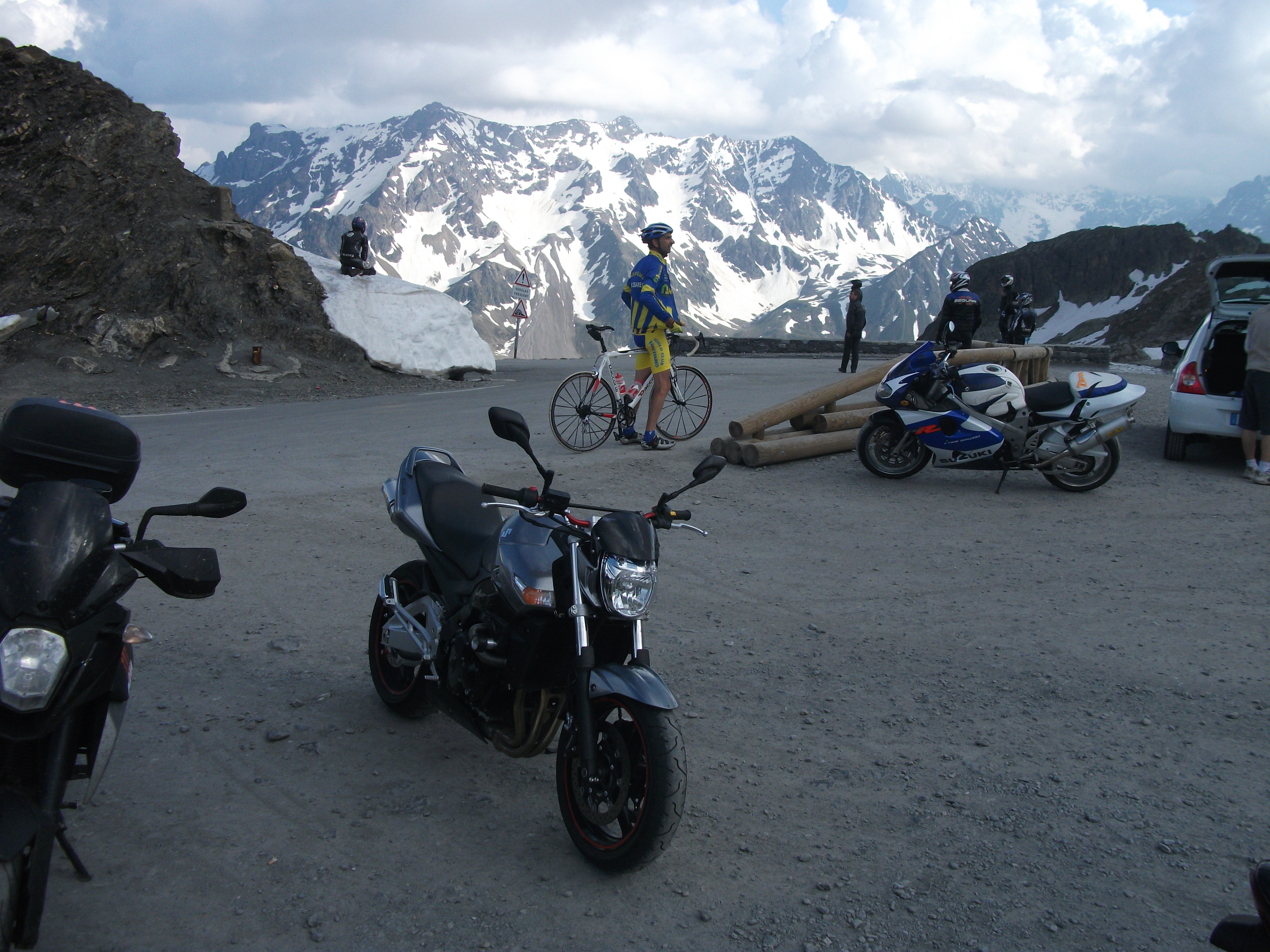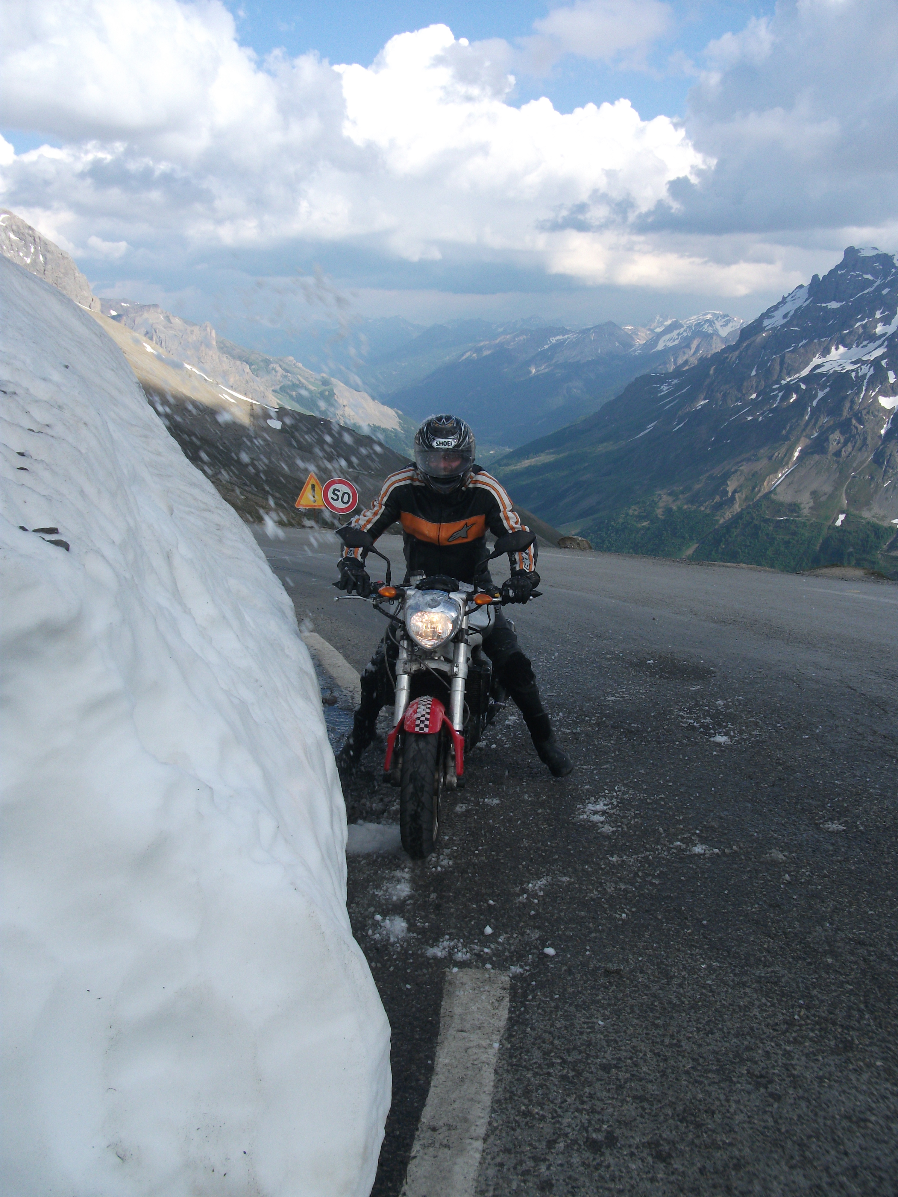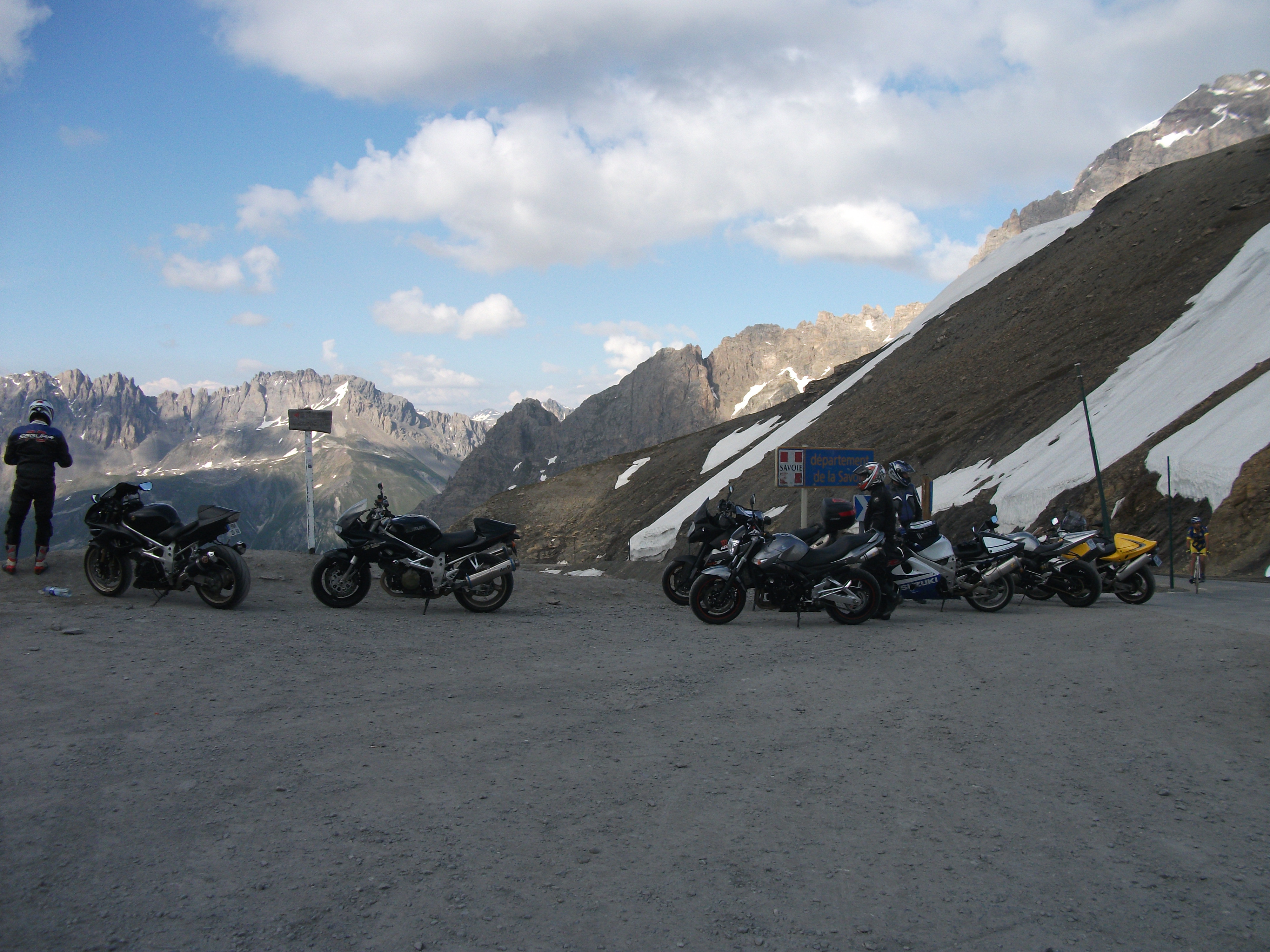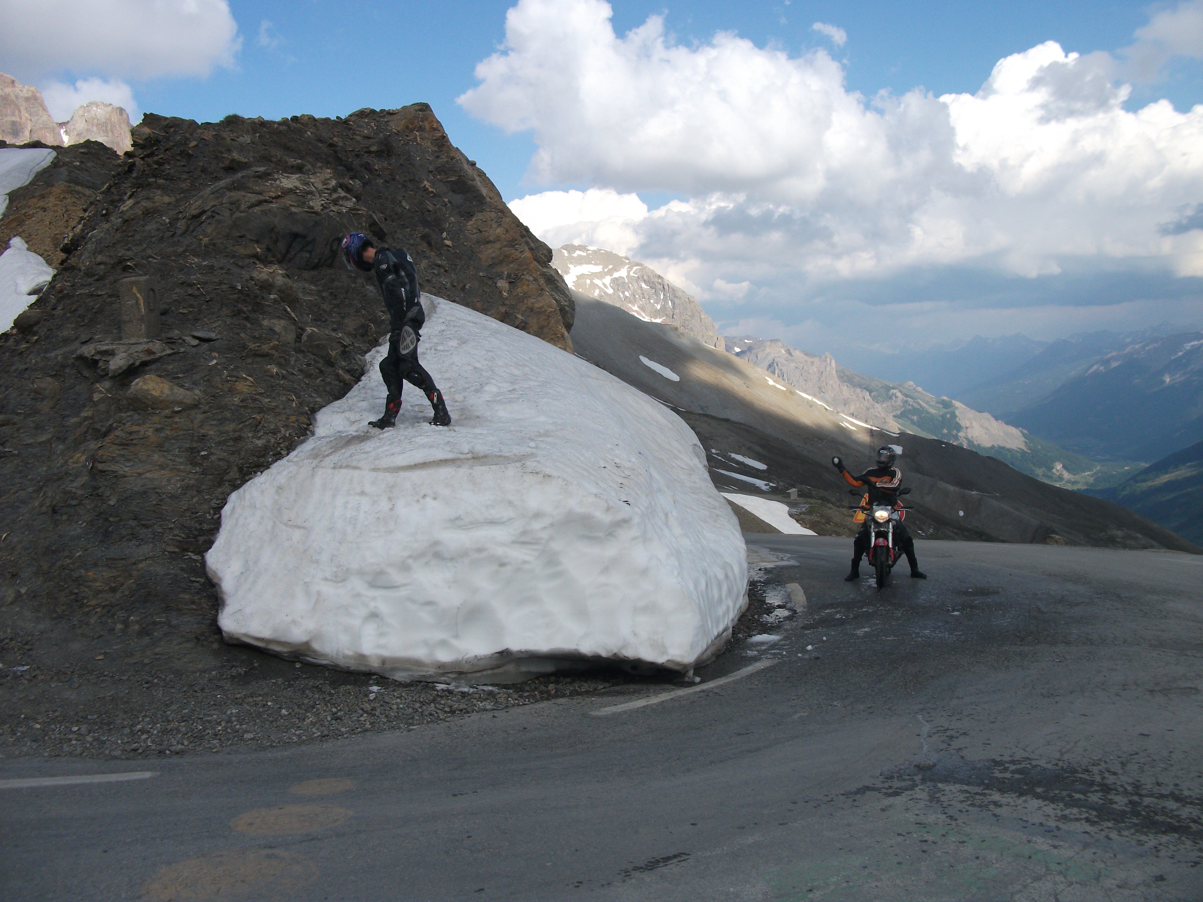 Arrivé au col du galibier , bapteme à la neige comme d’autres :mrgreen: :mrgreen: ….descente sur Valloire sans moteur …. Heu pour les mêmes raisons que plus haut , ça le fait pas …. , mais je m’amuse de voir Remi , PN et Leglude en decoudre .