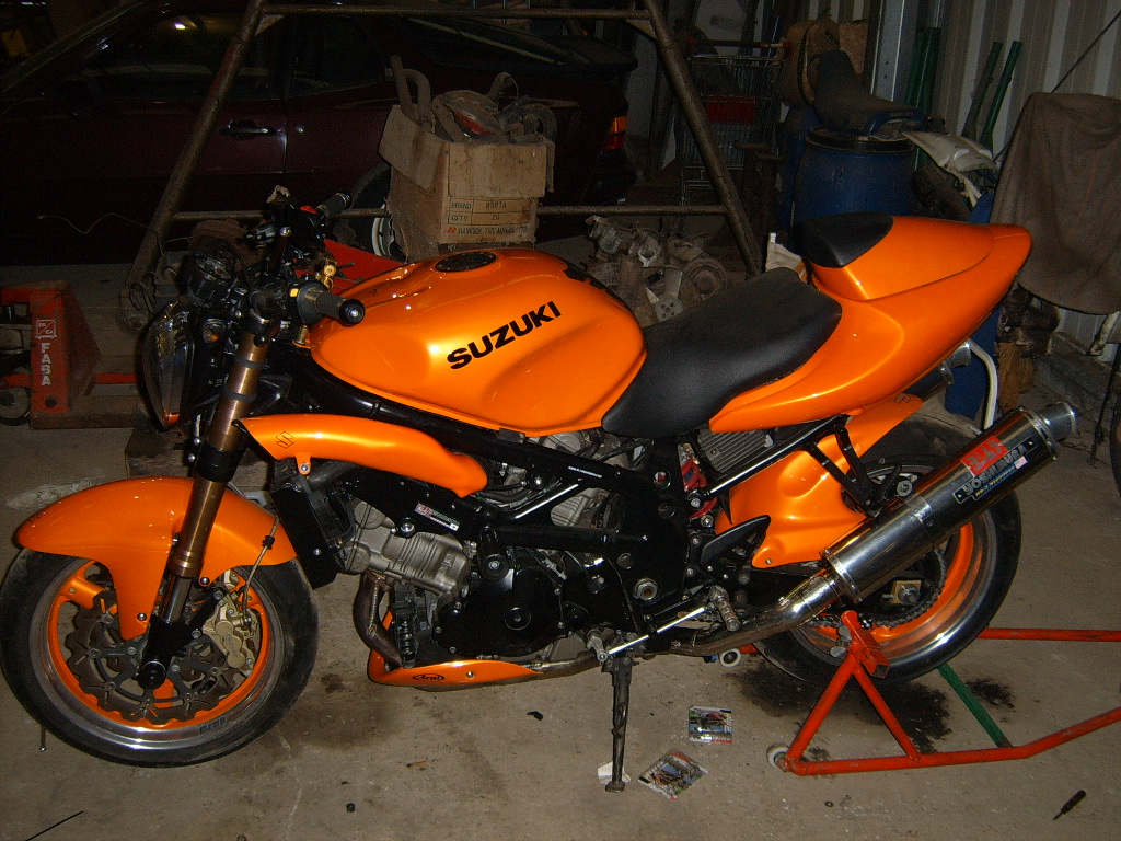 allais je vous lache 1 tof ,elel est dans sa derniere configuration,donc tout ce qui etait alu et qui pouvais ce faire anodisé a ete fait, j'ai refait met enveloppe yosh , frotté la ligne ,monté des nv etriers 6 pistons hayabusa et monte 1 amorto de direction pour evité le leger guidonnage du tls :D