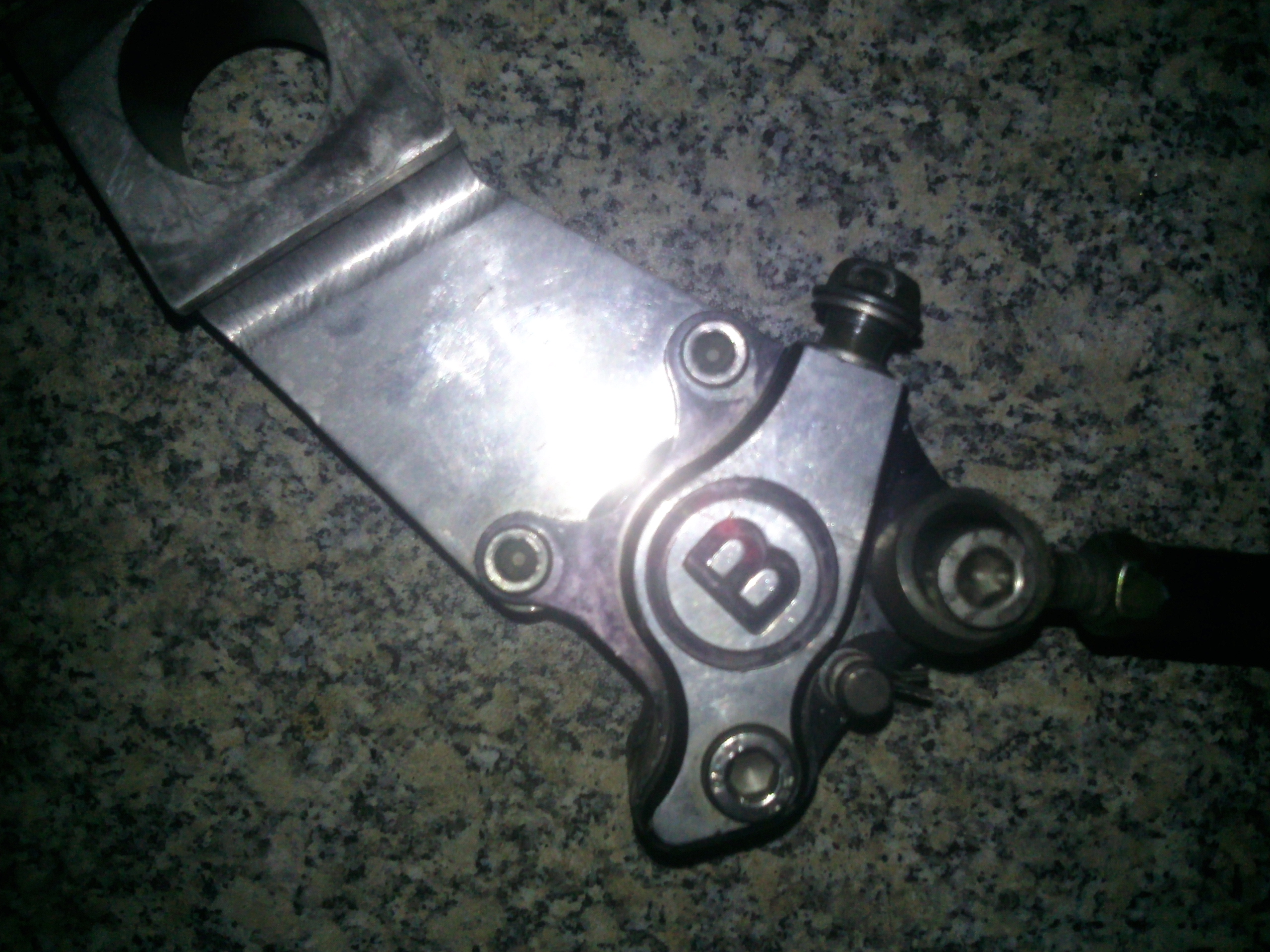 Etrier arrière racing Harrison Billet et son support. Se monte sur TLS TLR SRAD, et autre suz avec barre de maintien.