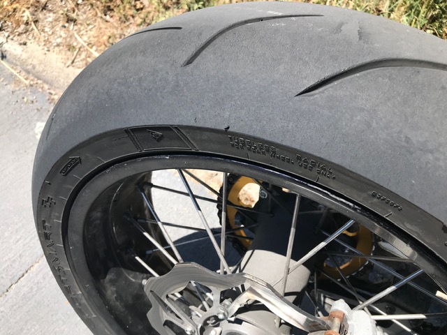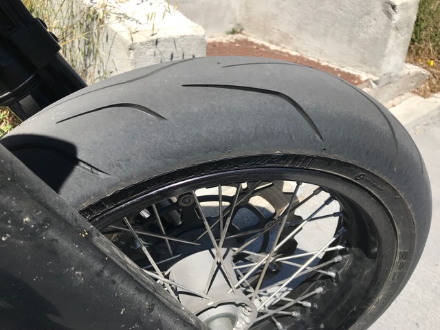En toute modestie, j’avais l’impression de prendre de l’angle avec la SuperMamie, mais là c’est encore un cran plus loin. D’ailleurs le pneu avant peu témoigner (alors qu’en général il reste toujours un peu de bande de peur devant, là c’est tout propre).